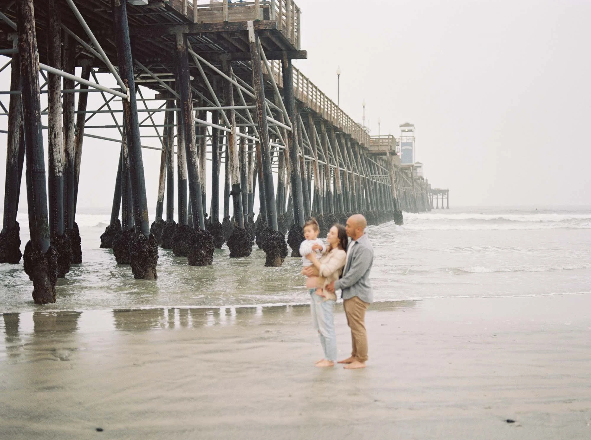 A family of three standing on a beach under a large pier with the ocean waves in the background.